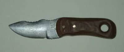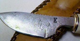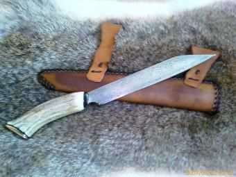 Eigene Arbeit: Kleines Sax, handgeschmiedet aus Balbach-Damast, Kappe Sinterbronze, Griff Elchgeweih.