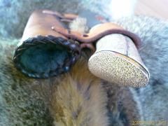 Blankleder natur, Lammfell-Futter, zweifach-Flechtnaht, Antikfinisch und Lederbalsam.