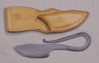 Eigene Arbeit: Sattelleder, Naßgeformt, punzierte Inizialen und Verzierung, Sattlernaht, geölt Klinge Balbach-Damast, umgeschmiedet, Feilarbeit