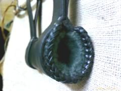 Dunkelbraunes Sattelleder, innen Lammfell, Einfassung mit zweifach-Flechtnaht, Sattlernaht.